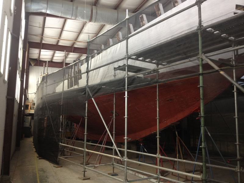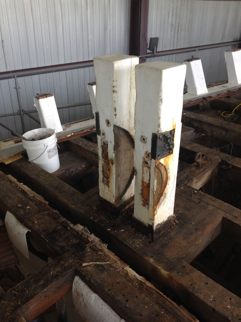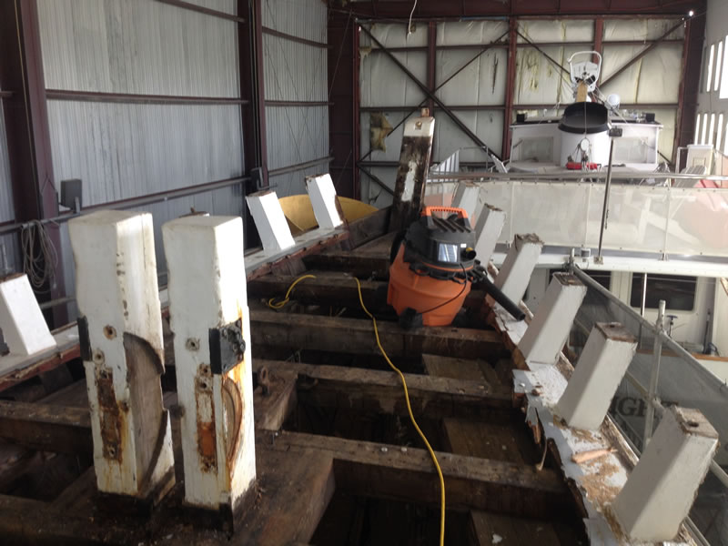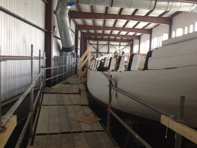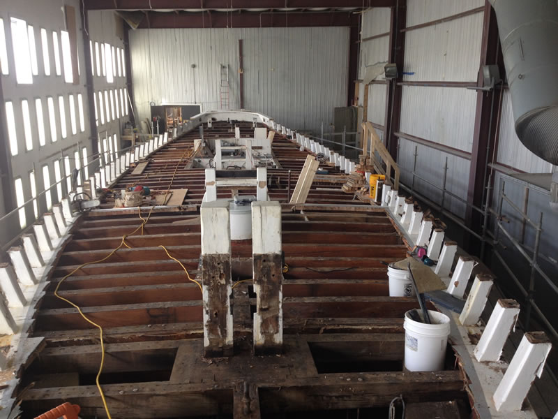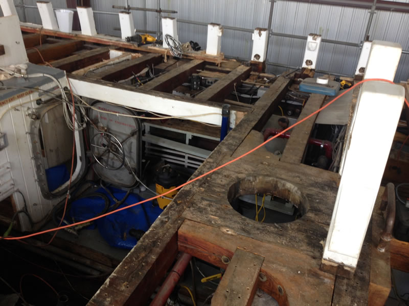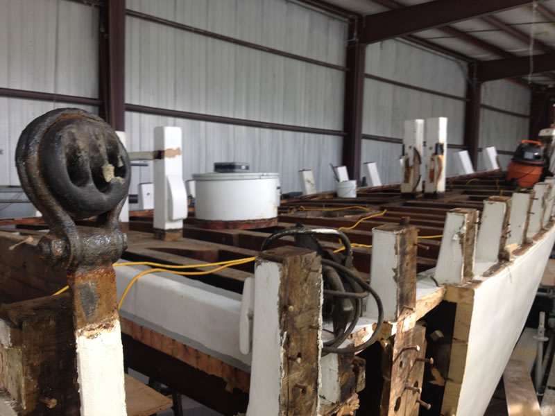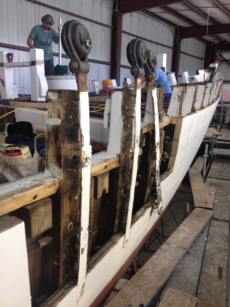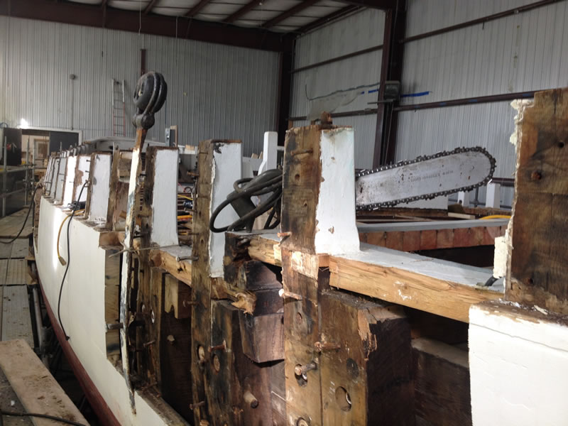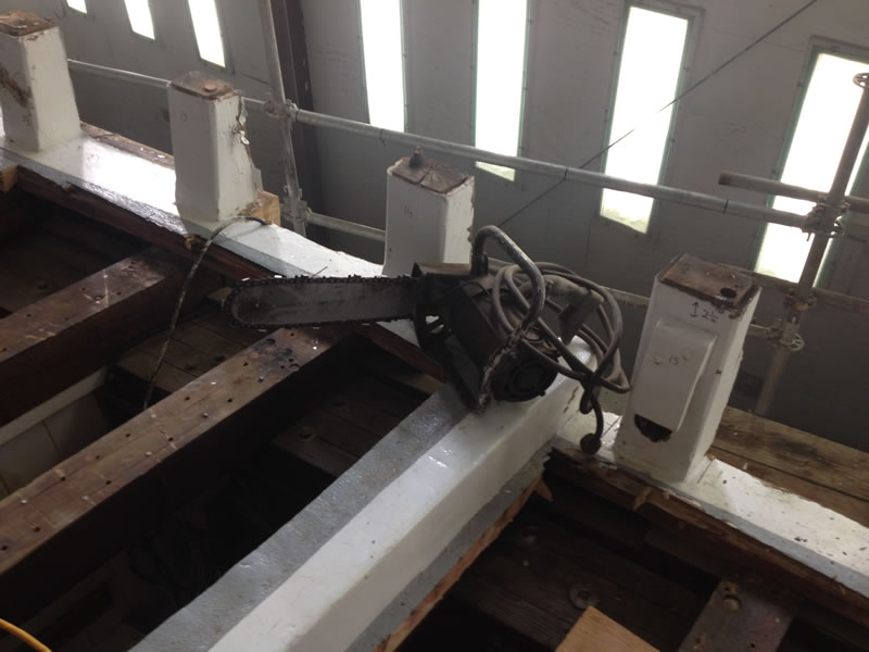 As you can see, we are almost finished with the demolition phase of the project. The cap rail is off, and the bulwarks, covering board, and shear strake are are right behind it. The ship’s saw has arrived, and we expect to take delivery of the wood it will cut next week. Stay tuned!