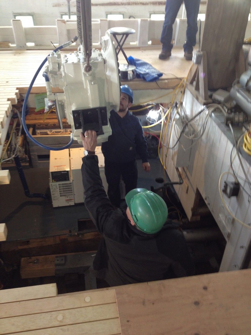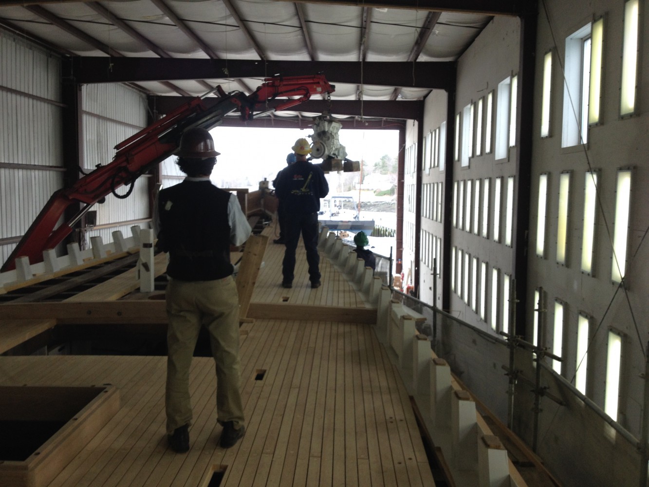 Yesterday was the first in a series of crane days for Bowdoin! This one brought us our newly rebuilt engine, our new generator, freshly constructed refrigerator units, and several deck houses. We searched far and wide for a crane that could do all of those things without taking the boat out of the building. Take a close look – it was a pretty cool machine that ended up doing the job.