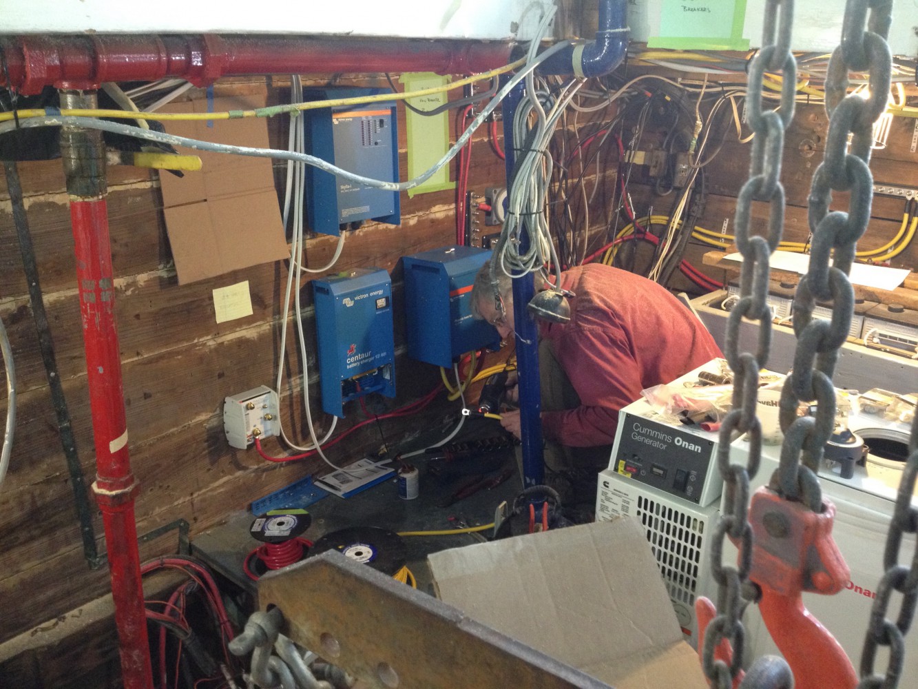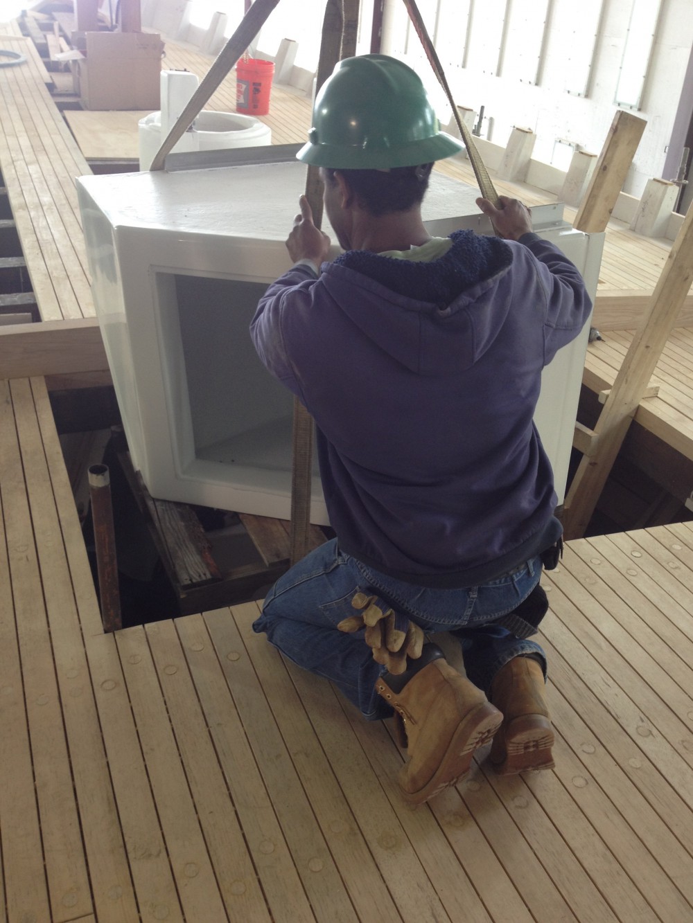 - The refrigerator units getting lowered into the galley.