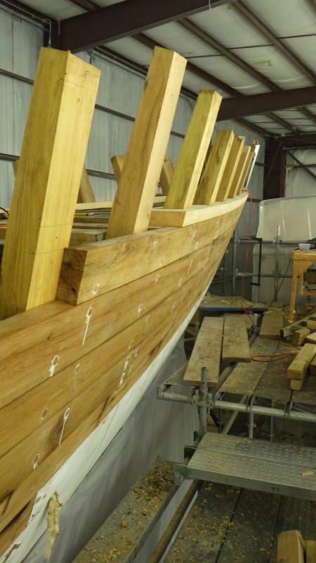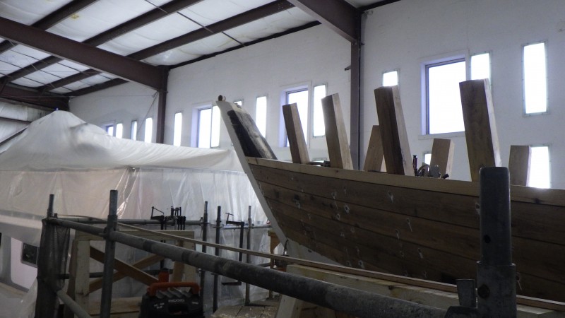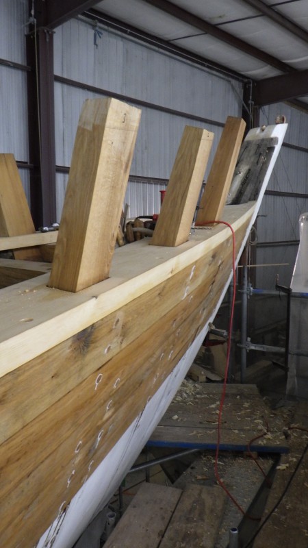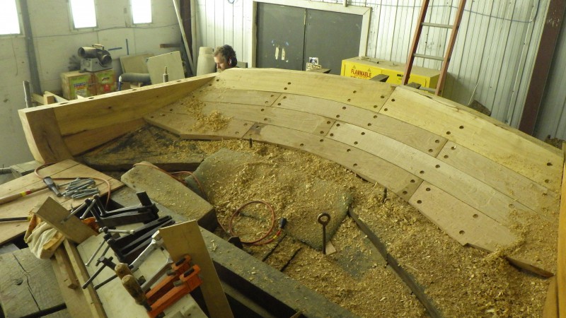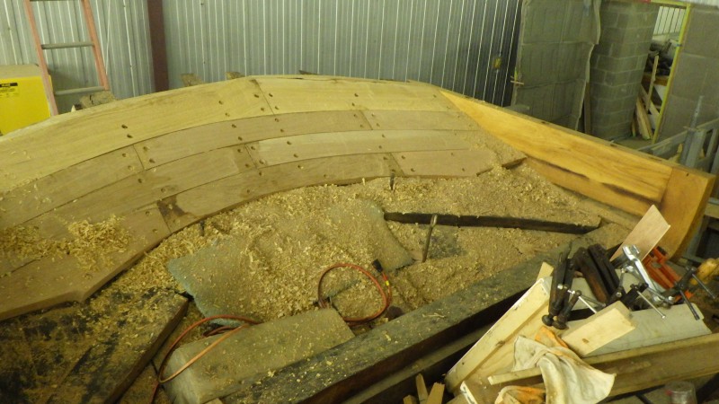 - We are almost done planking. Just a little more at the transom. But from this angle, she looks ready to go.