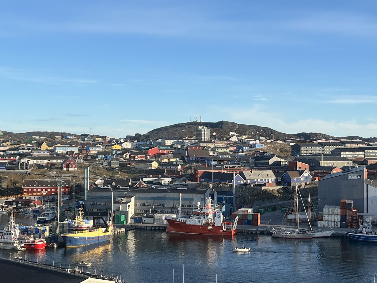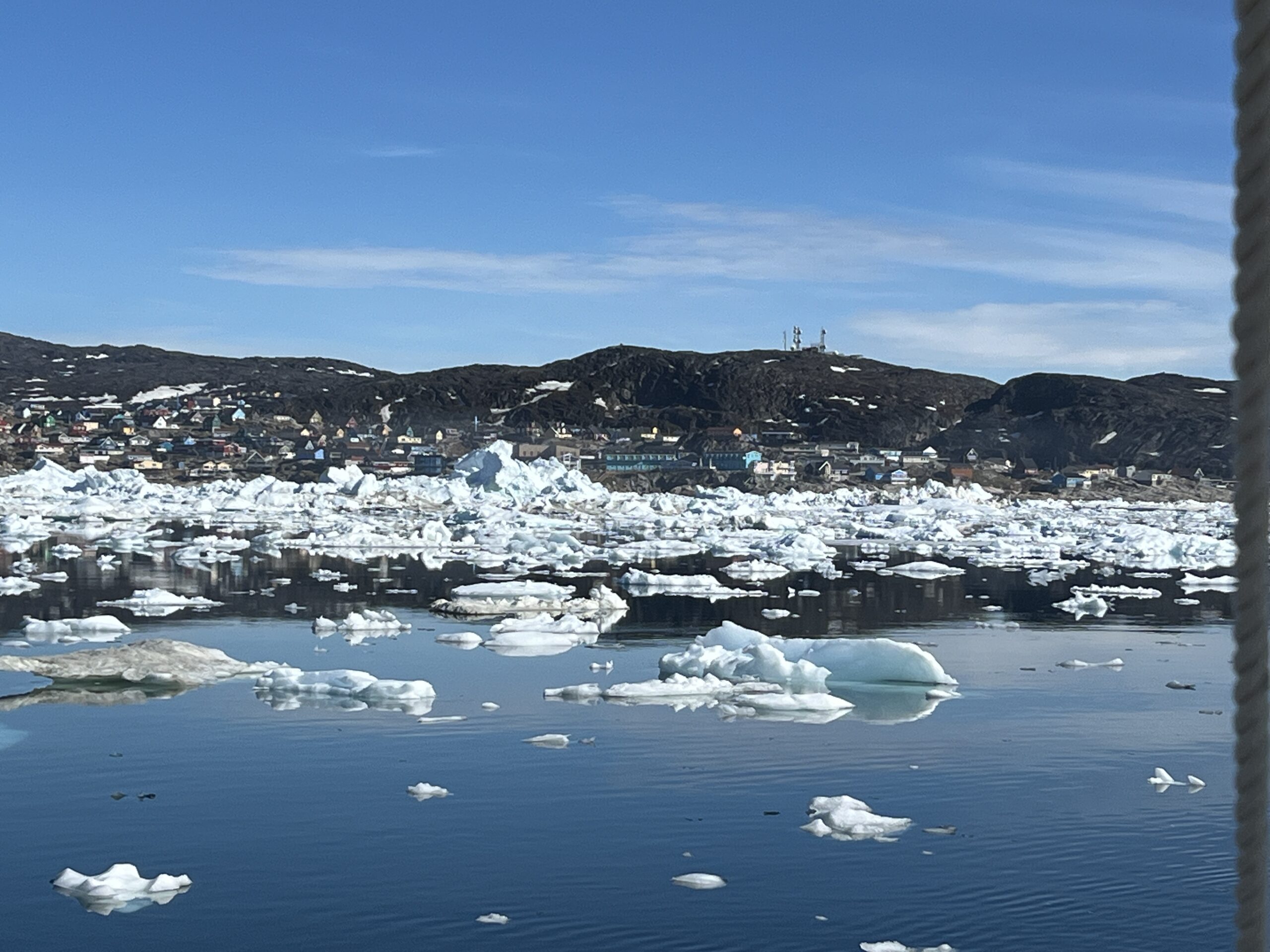 Sailing through sea ice and icebergs, we reached Ilulissat on Friday, June 21st, the third-largest city in Greenland, located approximately 220 mi north of the Arctic Circle. As of 2020, 4,670 residents call Ilulissat home. The city is home to almost as many sled dogs as people. Friday was also Greenland’s National Day. Although part of the Kingdom of Denmark, Greenland gained self-government in 2009.