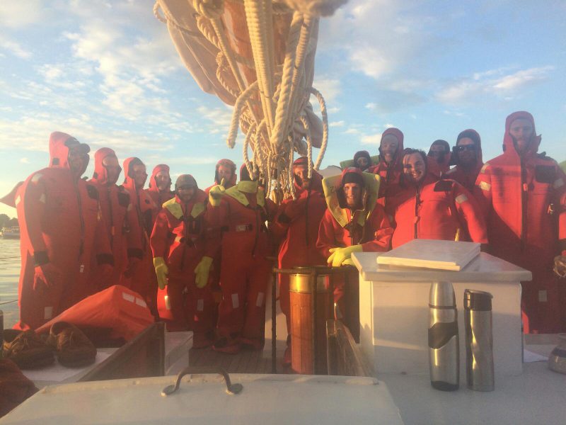 While underway we conducted another man overboard drill, as well as a fire/abandon ship drill after anchoring in Rockland’s harbor. All crew donned survival suits and can be seen smiling in the photo below (also on the the Maine Maritime Academy Instagram).