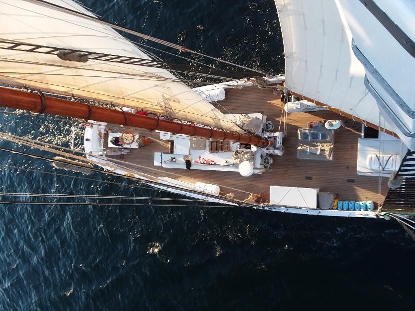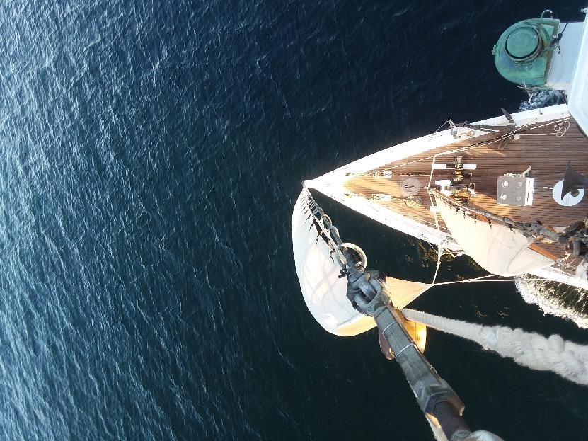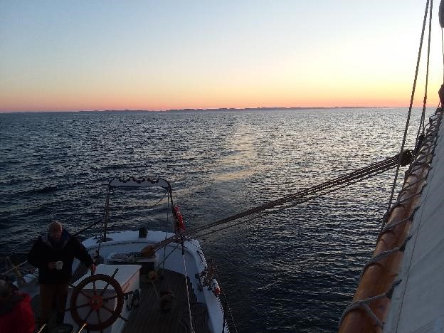 More beautiful conditions for practicing celestial navigation skills, but the best part of the day came in the afternoon as the wind began to fill in from the SW. The crew, who had spent the day learning the lines for controlling the sails, quickly hoisted all sail and the ship began to sail along at 5 knots. As the wind continued to fill in the ship began to clip along at a steady 7 knots. Great sailing for us, but our luck was not up yet. We saw several large spouts on the horizon which several crew thought to be either a blue whale or a large fin whale. The good sailing conditions continued through sun set after which we began our first three star fixes of the trip.