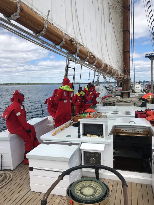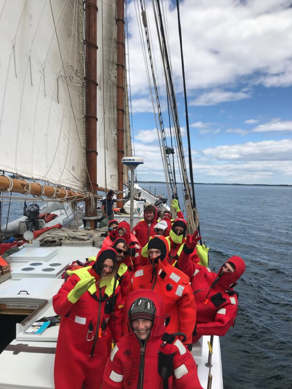 Bowdoin and her crew are underway again bound North towards Newfoundland. The crew spent the morning getting the vessel ready for more offshore sailing, rigging offshore life lines, and completing safety drills. We finished things off with an abandon-ship drill, with all donning exposure suits!