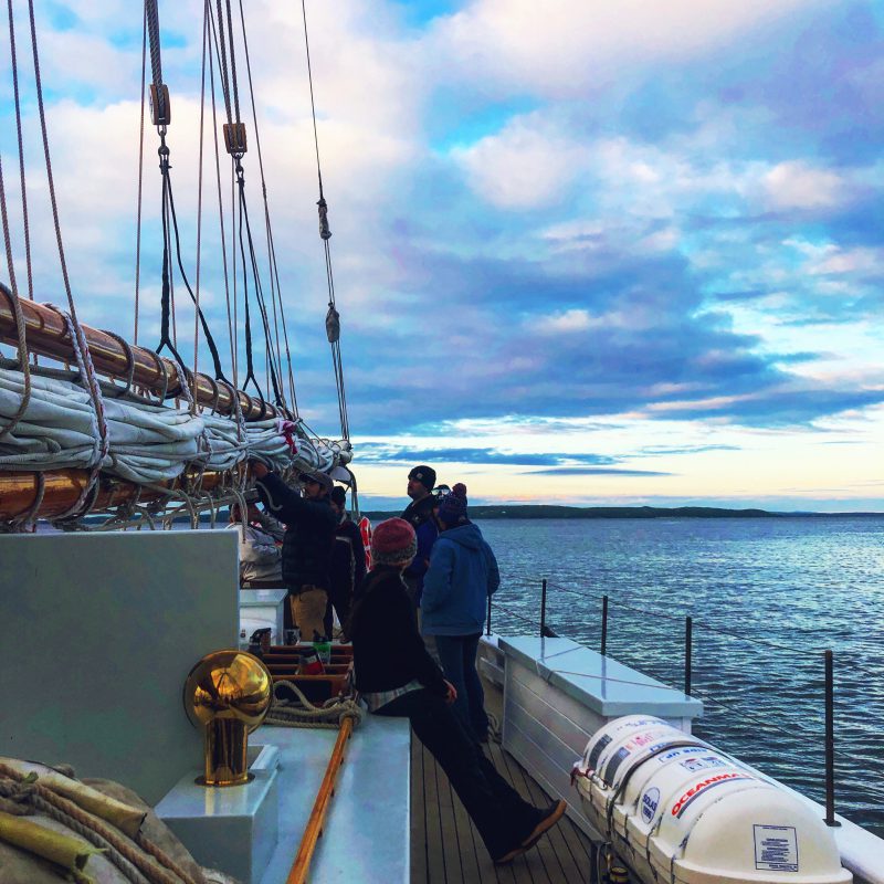 Bowdoin Arrived in Lunenburg after several days at sea. Everyone was eager to finally step foot on land as some of the crew recover from seasickness. Lunenburg is a town full of vibrant colors, beautiful music, and friendly people! The crew explored the town in the afternoon, going to the maritime museum, restaurants, and shops. They were able to taste some homemade ice cream and went rowing around the harbor in Bowdoin’s Dory as the sun set. Everyone was excited to go for a swim and finally take a shower and they’re looking forward to another great day in Lunenburg!