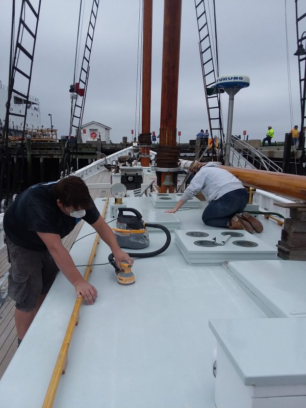 - Shannon and Andrew sanding on deck