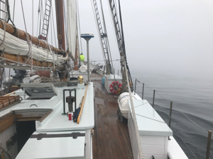 The ship and crew are underway bound for Lunenburg, Nova Scotia. We have been fog bound since we departed Rockland and are hoping for clear weather to practice our celestial navigation skills before we arrive in Canada.