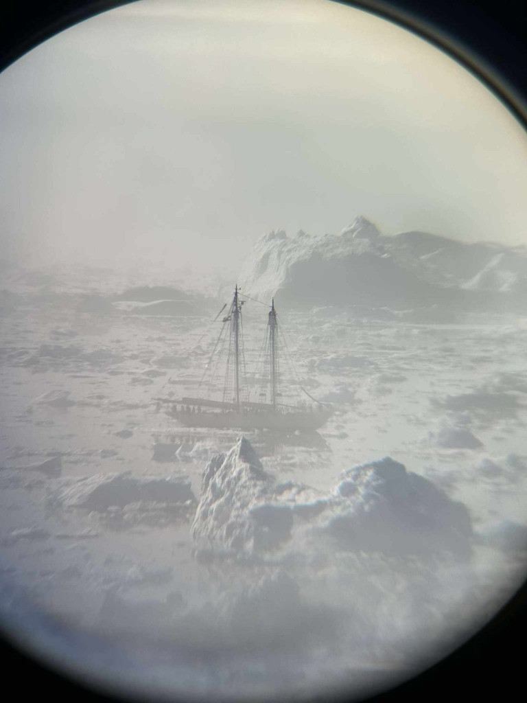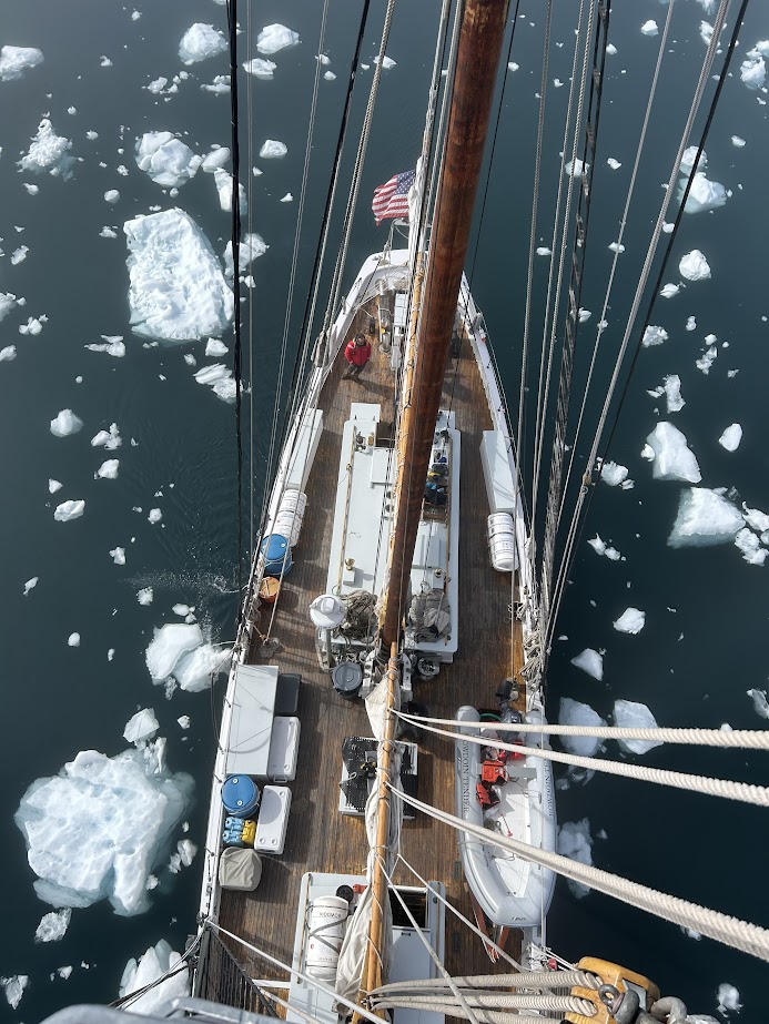 We aim to reach 70° North and are preparing to get underway, but for now, enjoy photos of Bowdoin from up high on her fore mast as we make our way through the sea ice to Ilulissat and local shots.