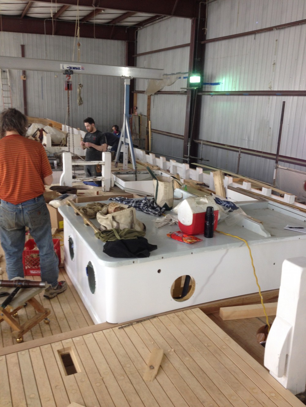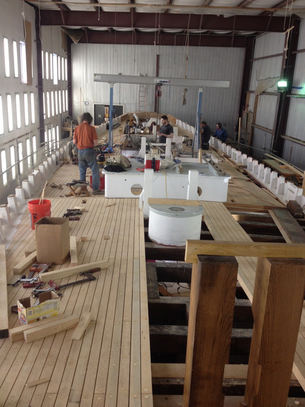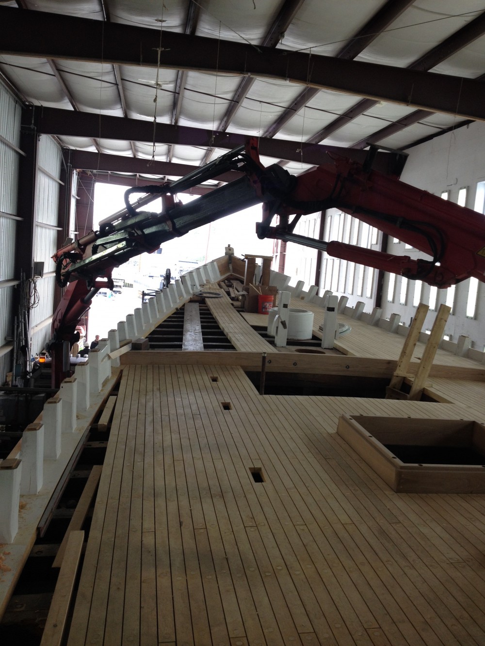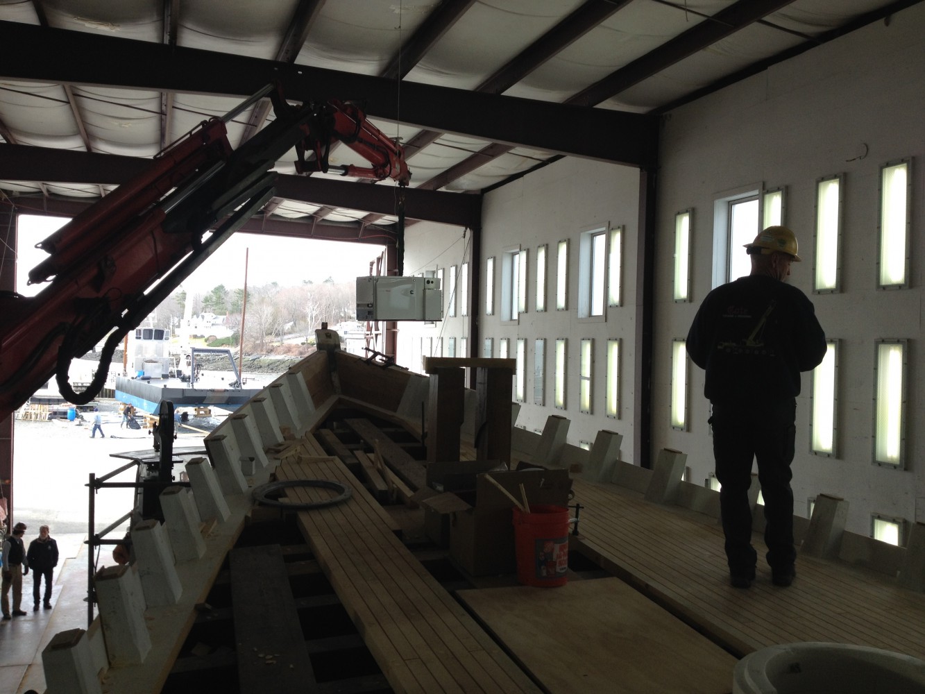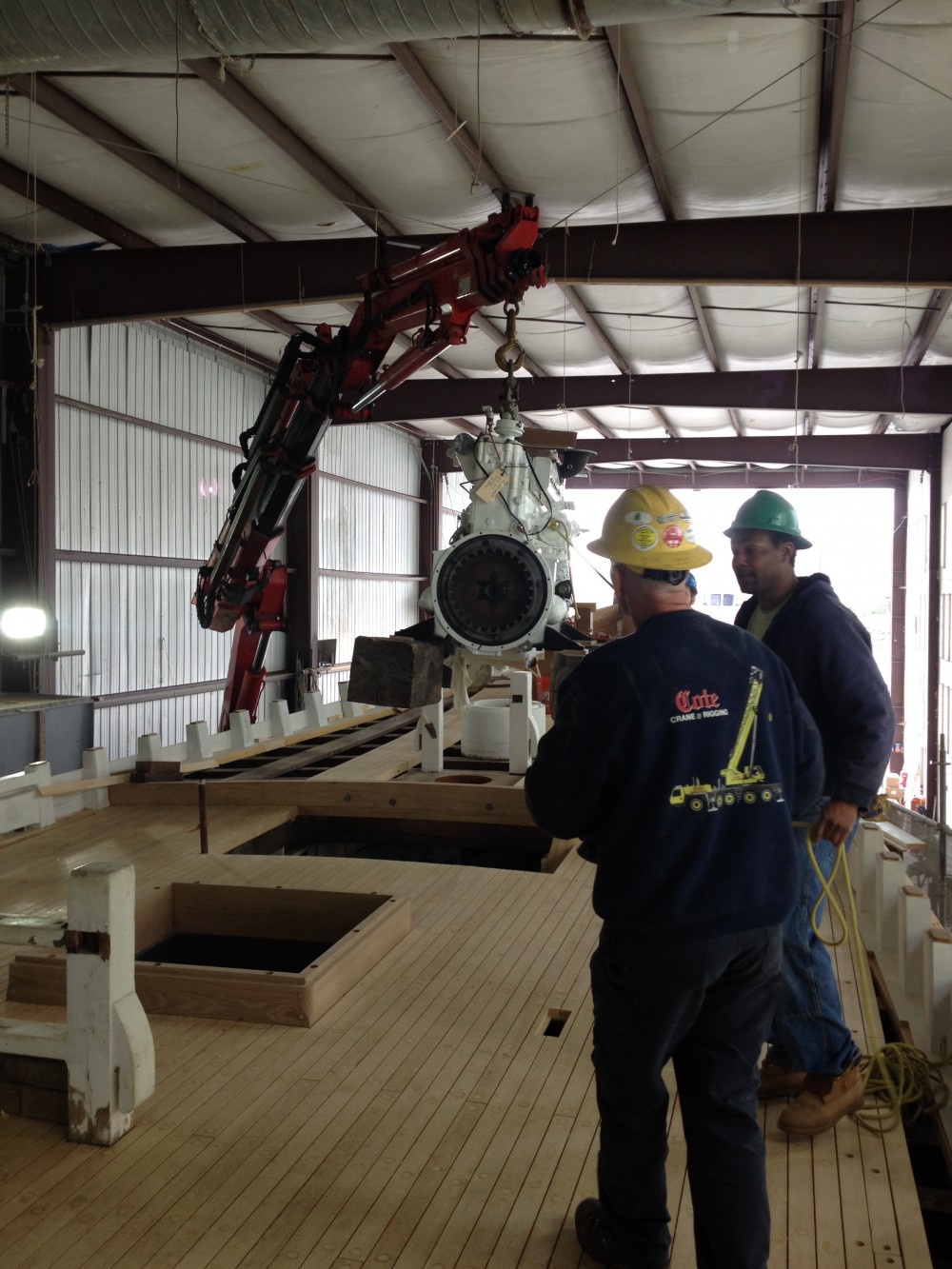 Yesterday was the first in a series of crane days for Bowdoin! This one brought us our newly rebuilt engine, our new generator, freshly constructed refrigerator units, and several deck houses. We searched far and wide for a crane that could do all of those things without taking the boat out of the building. Take a close look – it was a pretty cool machine that ended up doing the job.