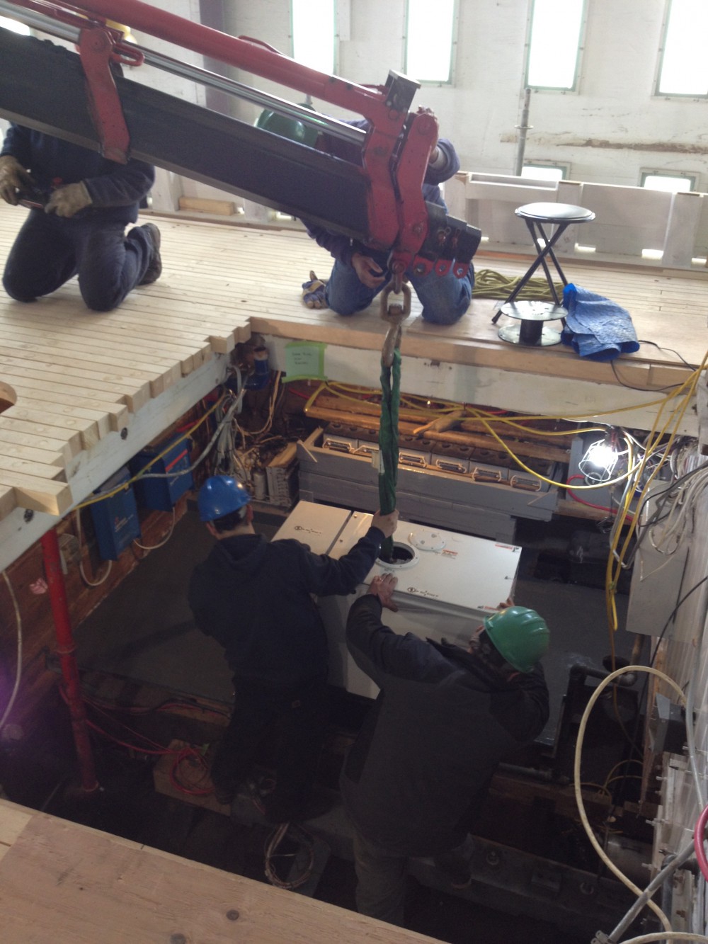- The refrigerator units getting lowered into the galley.