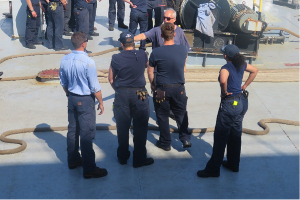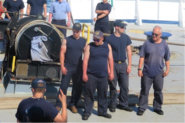 - Captain Slazas and 2/C Arena teaching 4/C Matos, Pellechia and McCarthy how to use winch operation hand signals correctly