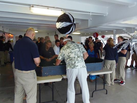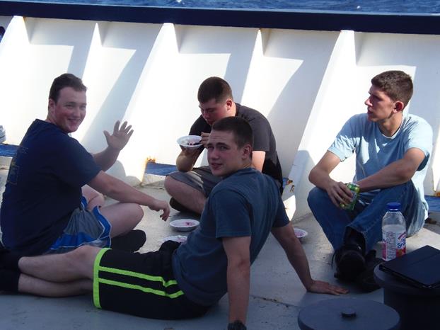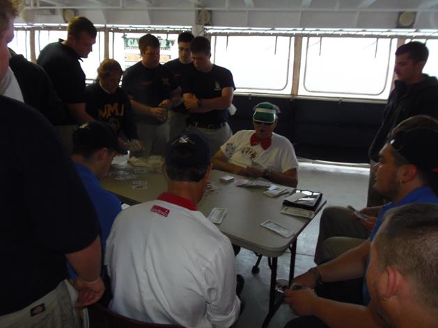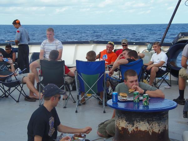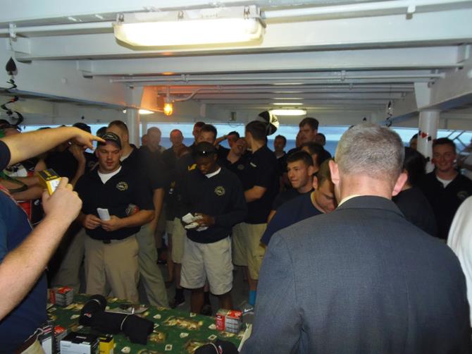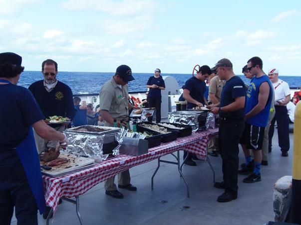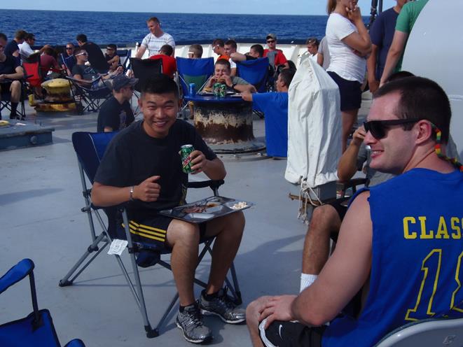 It was perfect weather for the final Holiday at Sea. The holiday began on the night of 8 July when LT Small and Ms Clark joined forces to put on TSSOM Casino Night 2015. Crew and Staff served as the house and dealers while Sodexo put on a sundae bar for those who lost all their monopoly money. The holiday basketball tourney kicked off at 1230 on the 9th and had spirited competition among all manner of teams both young and old(er). Finally, for dinner, Sodexo rolled out the grill one last time and served up a huge picnic capped by berry shortcake.
