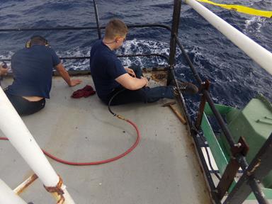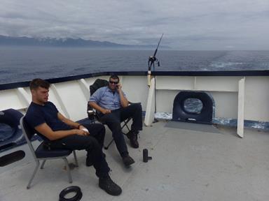 - 4/C Cronin and 4/C Rush back at it, hoping to catch a bite from anything as we pass between the Azores island. Also taking advantage of a little cell phone service as we pass by the islands to call home.
