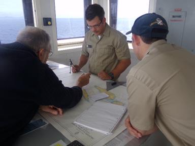 - Capt. Wood and 2/C Birmingham going over our approach to the Azores. They are using dead reckoning to estimate about what time we will need to make our course change.