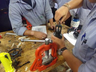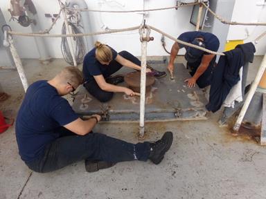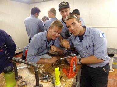 - 4/C Stalvey, 4/C Pecherek, and 4/C Roberts overhauling a valve during engine training.