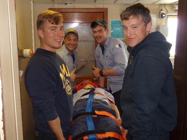 - Deck Instructor 3rd Mate Porter and Cadet Mates practice Medical Emergence Response.