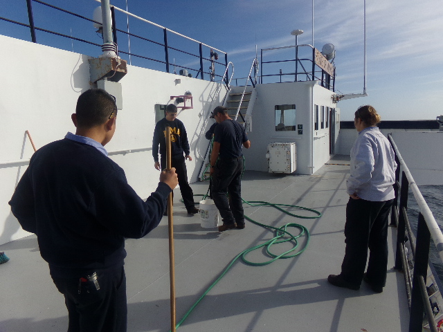 - 4/c Look and 4/c Mason prepare a hose, while 4/c Ma and team prepare to scrub down the Forward 04 Deck.