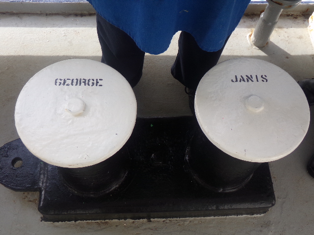 - Good friends, George and Janis, were surprised to find their names tattooed to a bitt on the Starboard side of the 1 deck. For the past 8 years, they’ve enjoyed sitting together and eating breakfast.