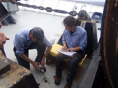 - 2/C McAfee receives instruction from Miss Osborne on how to properly take salt water ballast soundings. We take salt water ballast soundings every morning on the TSSOM.