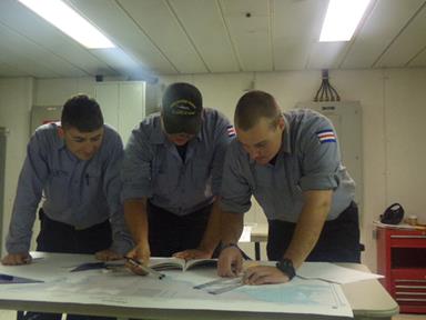 - Charlie 4/C DiGuglielmo, Cronin, and Clayton work on their chart plotting skills under the supervision of training officer Fader.