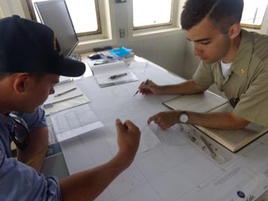- 2/C O’Connor discussing our planned course with 2/C Fosler. 2/C O’Connor is standing the MOOD (Midshipmen Officer of The Deck) watch, responsible for the safe navigation and operation of the Ship. 2/C Fosler is standing the BMOW (Boatswain Mate of the Watch) watch, in charge of operational tasks of the ship. Both cadets report to the licensed deck watch officer and are ultimately responsible for the safe passage of the ship.