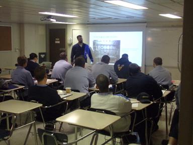 With a Low Pressure system forming to our West, we are staying just ahead of any significant weather right now and are continuing to have calm seas with plenty of sun. We crossed into the Gulf Stream late this morning and are experiencing warmer weather as well. Alpha started a 4-day run of Utility today while Bravo worked Maintenance. Charlie is finishing a 3-day run of Watch and Delta has been in the classroom and around the ship for Training.