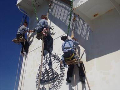 - Suspended by bosun’s chairs, bravo deck maintenance cleans and paints the aft house bulkhead. There are permits that must be filled out and every safety precaution is taken to make sure we are performing these tasks safely.