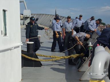 - 4/C Haith untangling the heaving line that is attached to the tug line. A heaving line is a smaller line that is thrown between vessels in order to pass the larger line to the ship.