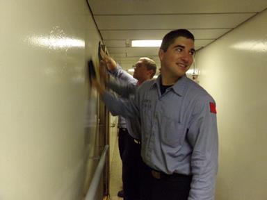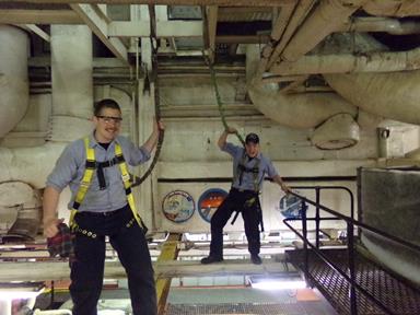 - 2/C Harmon and 4/C White excitedly pose for an action shot after scrubbing down insulation while suspended on the cross members above the SSDG flat of the engine room. As a safety measure when working aloft, midshipmen are required to use safety harnesses to keep them safely secured to a structural member in the unlikely case of a fall.