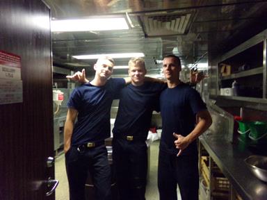 - Our Scullery crew (4/c Harper, 4/c Thomas and 4/c Stone) this morning taking a break before the lunch rush.