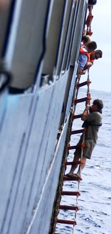That changed today at 0800, roughly 500 miles from Nova Scotia, when the bridge was contacted about a sailboat that reported taking on water. When the Midshipman Officer of the Deck (MOOD) plotted the reported location or datum, we noted that TSSOM was 29 miles away. Captain Eadie directed the watch to close datum while we notified RCC Boston that we were responding. By 0945 we had visual sighting of the sailboat, SV Prodigal, but we were unable to establish communications until just after 1000. While the ship was closing in on SV Prodigal, the Deck Department was busy checking the fast rescue boats and rigging various boarding options. They had a cargo net fastened to the main deck and hanging down near the waterline which would provide a large target area for us to bring the two vessels together and allow the one person on SV Prodigal to climb away from the sailboat. The crew also had a Jacob’s Ladder ready for once the sailor got clear of SV Prodigal so that the rest of the climb would be easier.