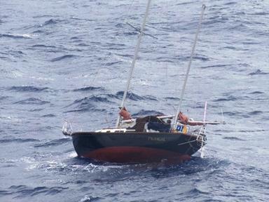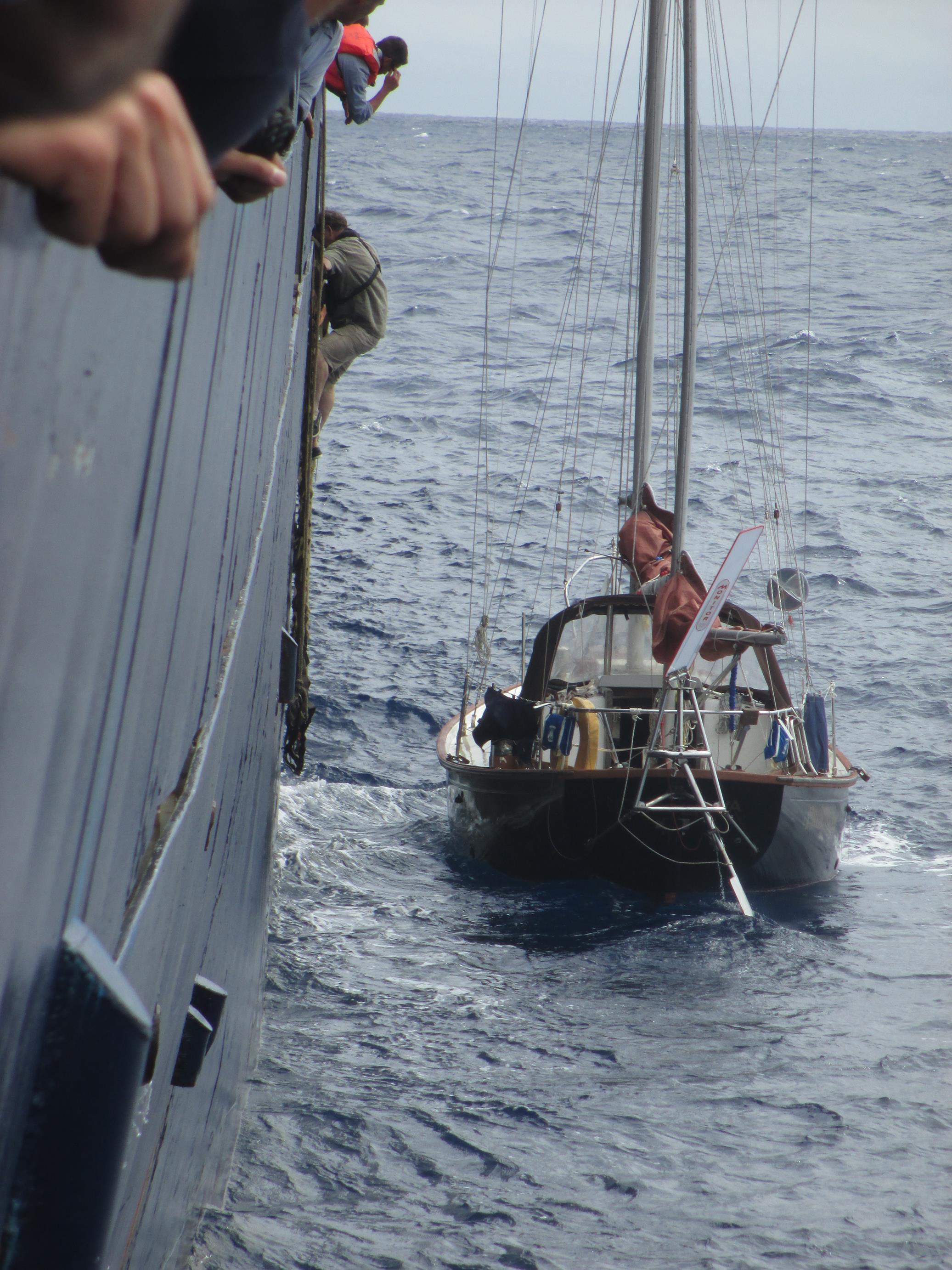 Once communication was established we were able to determine that the vessel was not sinking immediately. The sailor aboard, Captain Michael Hurley, was still able to operate the boat but sufficient damage had been done during several days of storms that the structural integrity of the boat was now in question. The Captain Hurley indicated that he needed to be removed from the boat as it was not seaworthy so we made our approach to put the boat in our lee while she motored up to our starboard side. After transferring several loads of personal gear off of the sailboat, her Captain (the only person onboard) stepped across to the cargo net and began his climb up the side of TSSOM. We radioed the last known position of SV Prodigal as we proceeded on course for Portland and 10 minutes later a Search and Rescue (SAR) C-130 out of Newfoundland flew over us and marked the sailboats position as well. By noon, our new guest was enjoying a hot meal and getting settled for the transit to Portland.