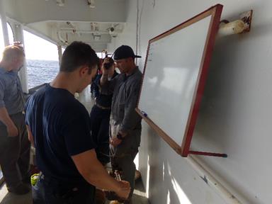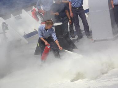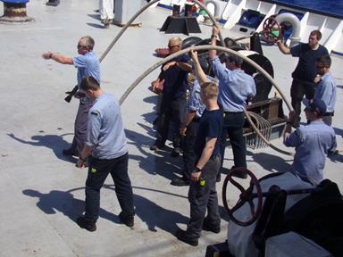 - Chief Mate McAvoy is demonstrating how to fight a bilge fire with the Damage Control team.