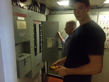 - 4/c Murray and 4/c Violette are testing breaker panels. After lunch today, a section of the ship was experiencing some electrical problems. Under supervision from the 2/c they were able to locate the problem.
