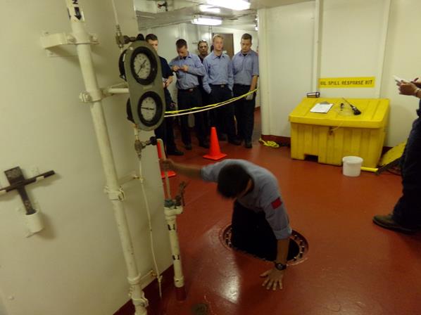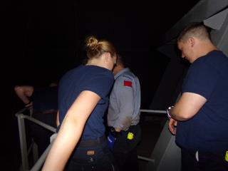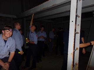 - 4/C Holmes and half of the Bravo 4/C in the forepeak ballast tank learning about confined space entry and some ship structure.