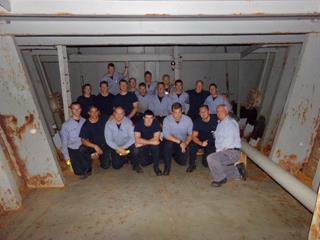 - A group photo of some Bravo 4/C with their instructor Capt. Slazas while on training in the forepeak ballast tank of TSSOM.