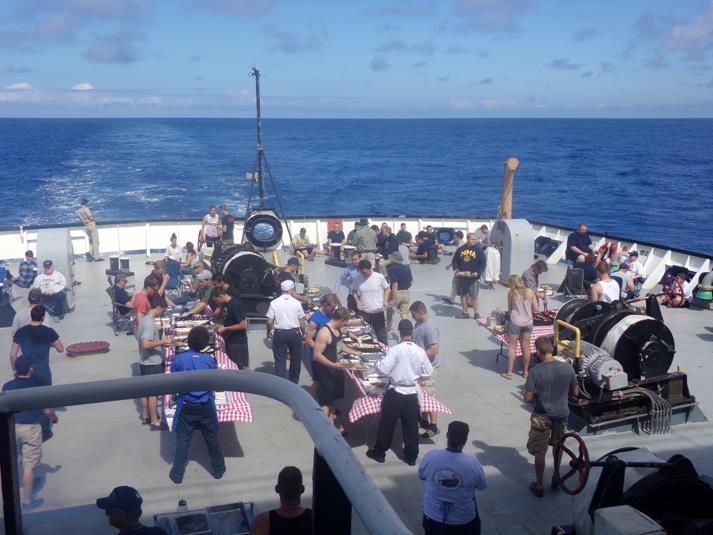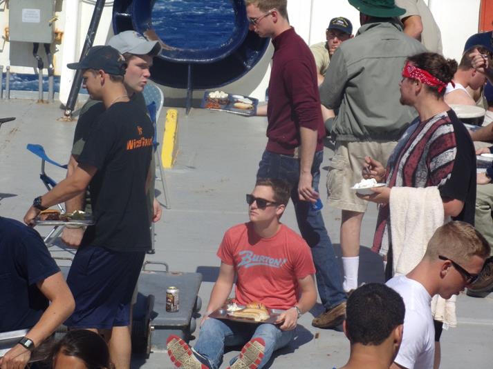 Calm seas and sunny skies prevailed for our holiday routine today. Students got some time to relax, work on cruise projects, play some games and had a great picnic put on by Sodexo. Charlie Company maintained the watch and Alpha took on the utility responsibilities which included setting up and tearing down the picnic on the fantail. We continue to roll the clocks back as we get closer to the Eastern Time Zone and with this holiday, I expect the students will be recharged for the final push to Portland.