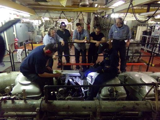 - Now that the main engine has been stopped, the 1st, 2nd, and 3rd engineers along with some 2/c midshipmen prepare to remove the misfiring fuel injector on cylinder number 5.