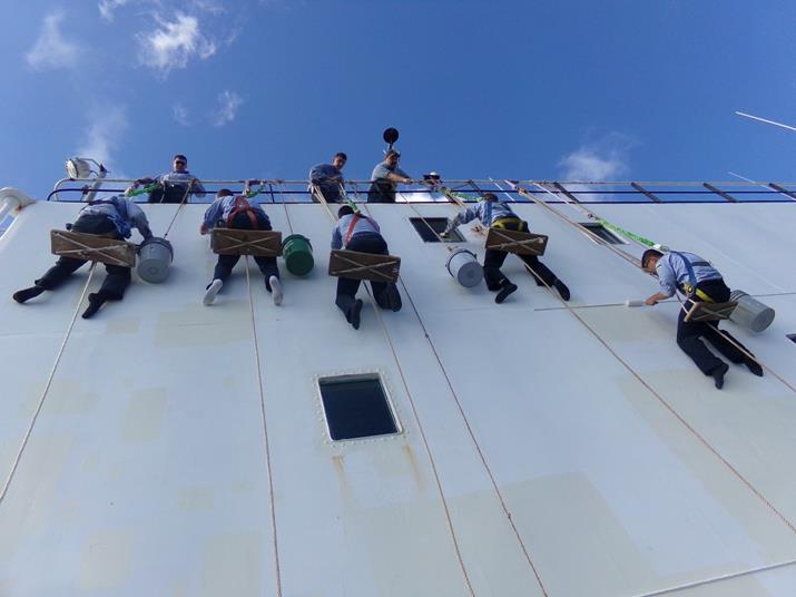 - Delta deck maintenance hang from the O4 Signal Bridge on bosun chairs while painting the starboard side of the forward house.