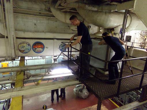 - 4/C Foelix and 4/C Farese scrubs soot build up off the I-Beams in the EOS flat of the engine room during engine maintenance. This is in preparation to paint the I-beams in the near future to prevent corrosion on any exposed metal.