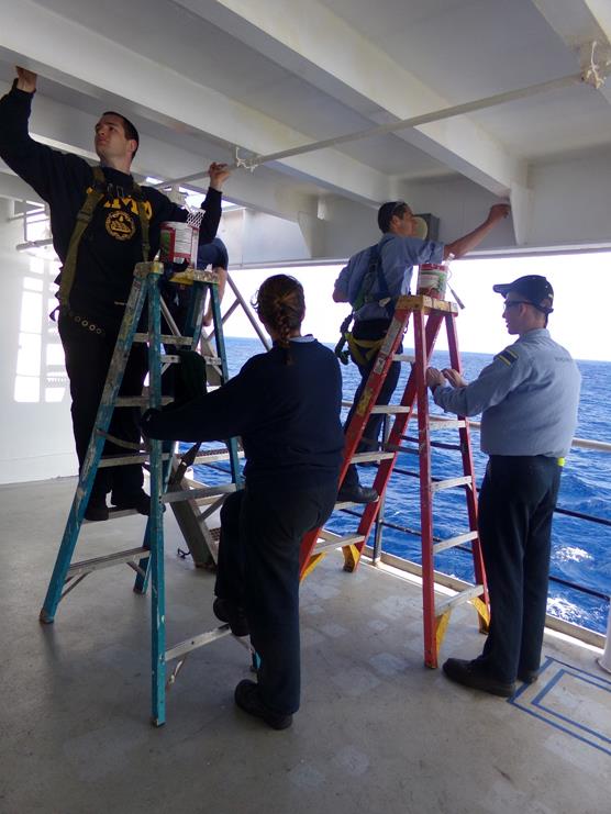 The seas calmed down over night and work aloft was able to continue today. Meanwhile, the fuel injector for the #5 cylinder was not providing sufficient fuel so we switched over to the electric drive while the engineers swapped out injectors. We were up to speed again by noon and the students now have a project taking apart and cleaning the removed injector. Sodexo put on a “Fried Food Night” this evening with fried cheese, jalapeno poppers, and anything else they could find that would fit in the fryer.