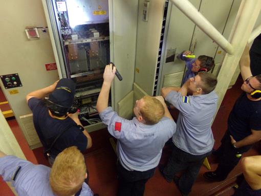 - The ships electrician and several students check the rectifier before starting the ships electric motor.