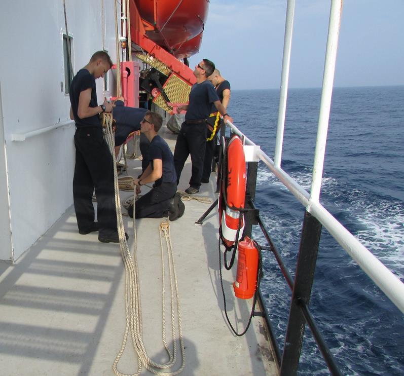 - 4/C Zinni and 4/C Reed along with 3rd Mate Josh Taylor prepare to rig the Bosun Chair up to the 03 reception deck for paint preparations.