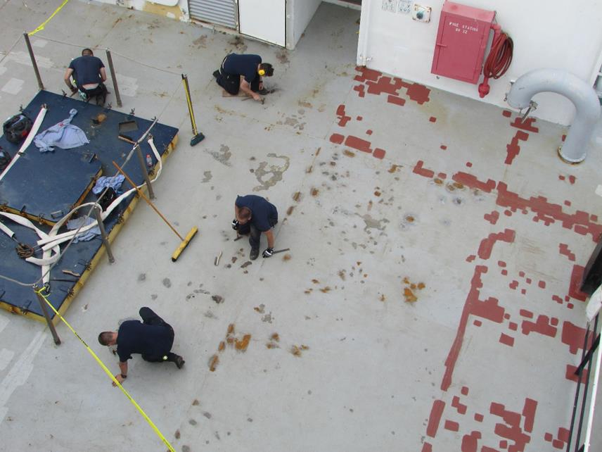 - Alpha Company Deck Maintenance group is chipping and spot priming the main deck to prevent rust build-up and to prepare the deck to be painted.