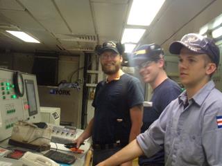 - Mr. Murray, the ships electrician, working with a couple Charlie company midshipmen on the oily water separator alarm system.