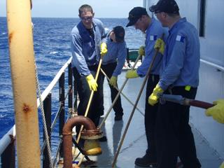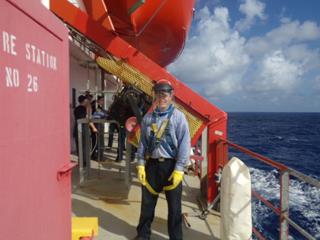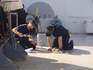 - Hard at work cleaning the decks (and cooling off under the hose).
