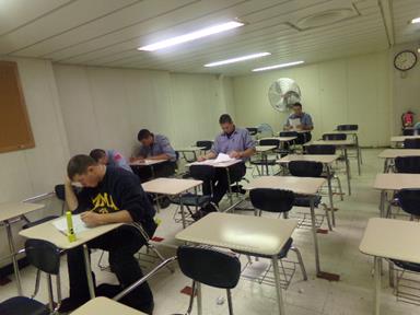 - A few delta 4/C students still remain in the 3 deck classroom, tediously double checking the answers on their final cumulative deck training exam. They have been diligently studying for the last several days and are determined to see the fruits of their labors when they get there scores back this evening.
