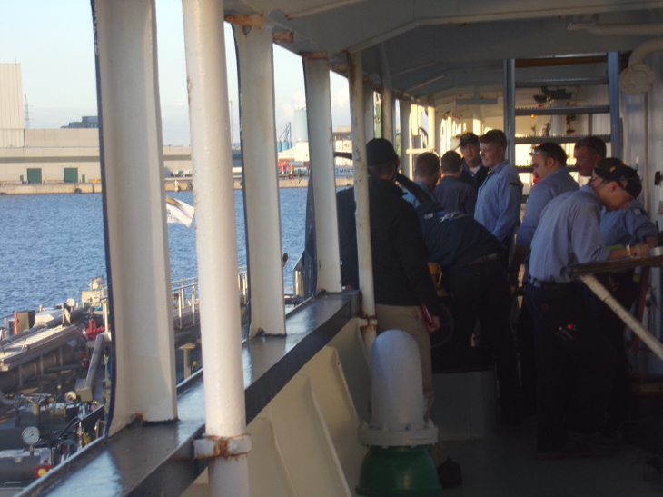 - A few midshipmen watch from the flying bridge as we pass cargo facilities to starboard and a nuclear power plant to port.
