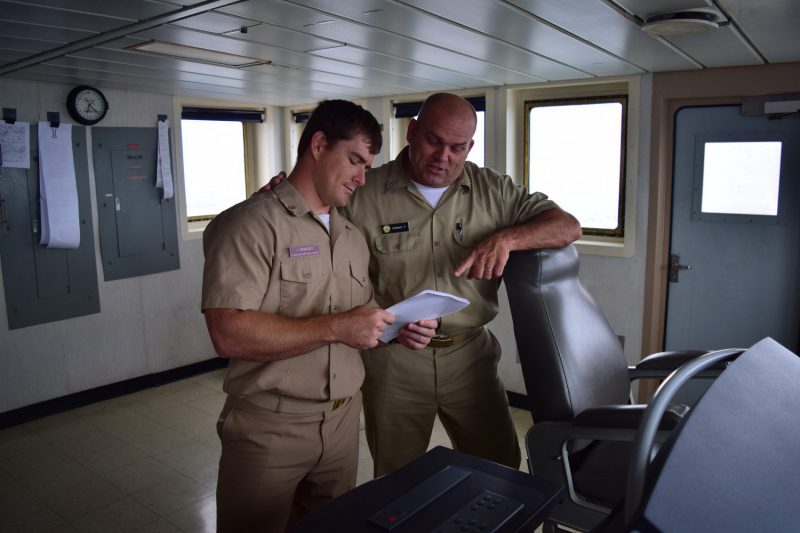 - 2/C Whatley and Commander Stewart deep in conversation on the bridge