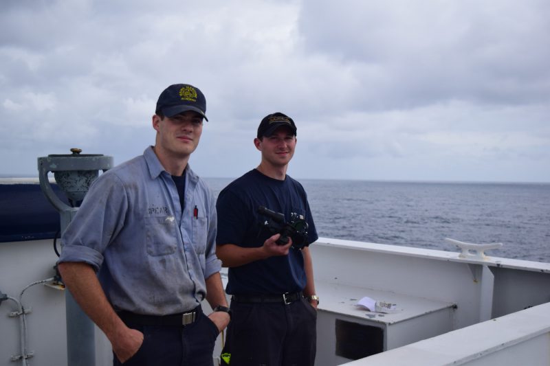 - 2/C Spear and Smith practice their celestial navigation out on the bridge wing